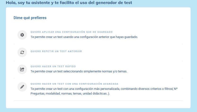 Una de las grandes novedades que incorpora nuestra plataforma es el asistente del generador de test, una guía con la que configurar de forma rápida el test que quieres realizar, además de basarte en tus configuraciones guardadas, repetir pruebas ya realizadas, generar un cuestionario rápido o un test con una configuración mucho más avanzada.