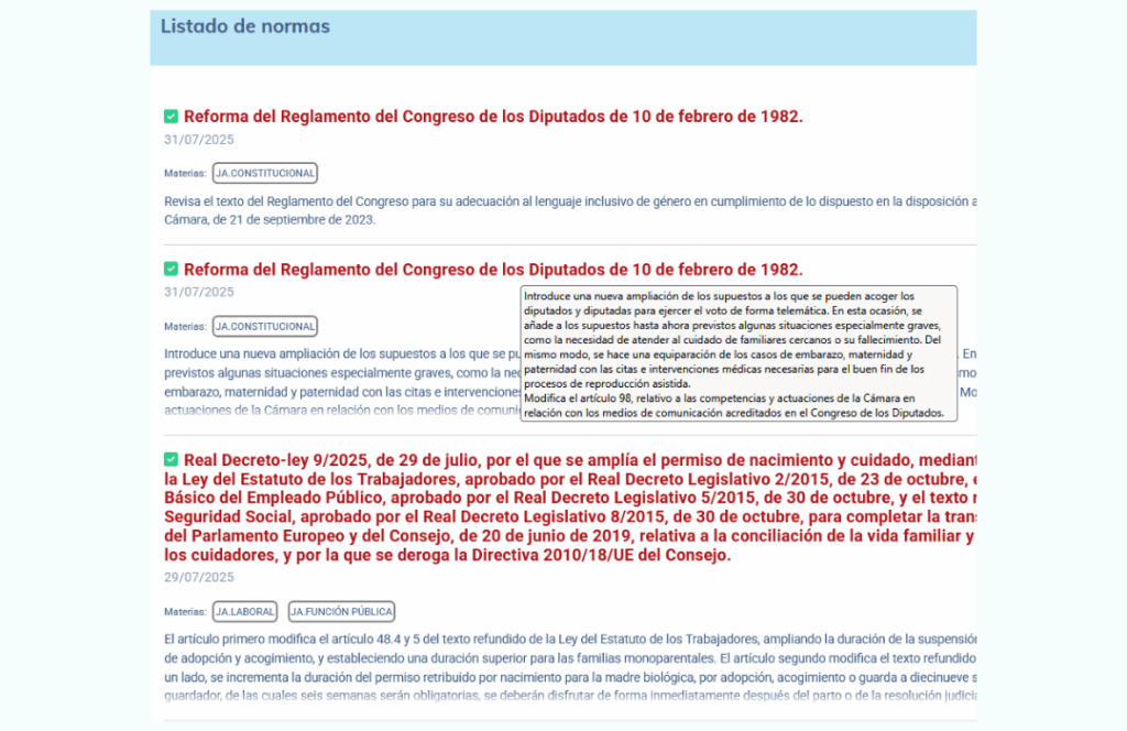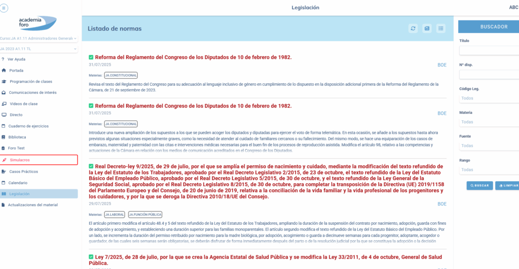 Además, hemos incluido una reseña con el contenido más destacado de cada norma de nueva publicación. Esto facilita la búsqueda y localización de la norma que nos interesa en el listado. Por supuesto, se mantienen los criterios de búsqueda habituales dentro de la propia legislación, que tanto gusta a nuestros alumnos. Fácil, rápido y cómodo.