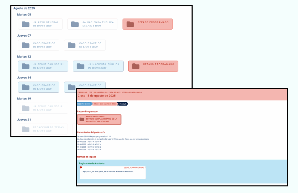 Siguiendo la esencia de este sistema, incluimos en la planificación de estudio semanal el repaso programado de las unidades didácticas estudiadas con anterioridad. Así, conseguimos mantener vivo el temario ya visto en todo momento. Y no solo por el hecho de que se incluya en las planificaciones semanales, sino porque también se aplica en los casos prácticos.